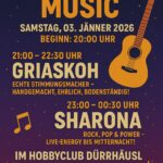 🎶 LIVE NIGHT MUSIC – Samstag, 03. Jänner 2026 📍 Hobbyclub Dürrhäusl🕗 Beginn: 20:00 Uhr Erlebt einen unvergesslichen Musikabend im Dürrhäusl!Mit zwei grandiosen Live-Acts: 🎤 21:00 – 22:30 Uhr – Griaskoh Echte Stimmungsmacher – handgemacht, ehrlich, bodenständig! 🎸 23:00 – 00:30 Uhr – Sharona Rock, Pop & Power – Live-Energy bis Mitternacht! 🍻 Barbetrieb & […] ▸ Lesen Sie weiter
